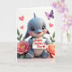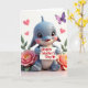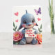 This card features a cute, stylized baby marine creature in smooth cerulean blue, with big dark eyes, tiny lashes, and rosy cheeks that give it a tender, affectionate look ❤️. Seated at the center, it gently holds a small white sign as if offering it to someone special, creating a quiet moment of closeness. The message text sits on the sign in dark lettering, with a small red heart accent near the words for a sweet romantic touch. Around the character, blush-pink and soft peach flowers spread across the lower area, their layered petals and green leaves forming a cozy frame like a bouquet being presented. The background is softly lit and hazy, keeping attention on the character and flowers while adding a dreamy, intimate mood. A few small pink hearts float upward, suggesting a shared bond without needing any extra words 🌼. Near the upper area, a single purple butterfly hovers beside the drifting hearts.