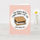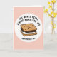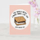 This card features a circular badge centered on a soft blush-pink background, with a cozy dessert illustration that feels like a sweet little hug ❤️. Inside the circle, two golden-brown rectangular biscuits with tiny dots gently “hold” a thick layer of dark chocolate and a fluffy white marshmallow, like close friends leaning in together. Dark outlines define each layer and edge, keeping the treat graphic and easy to read. Along the top curve of the circle, black lettering reads “THE WORLD NEEDS S’MORE MUMS LIKE YOU,” wrapping neatly over the dessert. Along the bottom curve, the message “HAPPY MOTHER’S DAY” appears in matching black text, balanced to mirror the top line. The warm biscuit tones, deep chocolate, and bright marshmallow stand out against the peachy background, giving the whole design a soft, affectionate feel 🌼. The emblem sits centered, with the text forming a tidy ring around the treat on the pink field.
