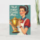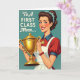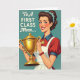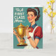 Designed with a retro commercial-art look, the illustration shows a cheerful woman celebrating an achievement with a bright smile and sparkling blue eyes that seem to meet yours with friendly confidence ❤️. She wears a classic curled hairstyle dotted with small blue flowers, adding a gentle, affectionate touch to her polished appearance. In her arms, she hugs a shiny golden trophy close to her chest, like she’s proudly sharing the moment with someone she cares about. The background is a calm teal, set against her scarlet outfit and a crisp white apron that keeps the scene lively without feeling busy. Small details stand out, including a gold medallion at her neck and a red beaded bracelet at her wrist, giving her a thoughtfully put-together look. Near the top, the message “To A FIRST CLASS Mom...” is placed overhead in dark lettering, standing out clearly against the teal space 🌼. The trophy is rendered in bright gold with layered shapes and reflective highlights, held at a slight angle so it catches the light.
