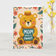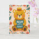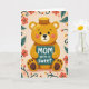 Designed with a cozy digital illustration style, this card centers on a plump, bear-like figure shaped like a honey dispenser in warm honey-gold and amber tones. A ridged cap sits on top, and the character’s rosy cheeks, gentle eyes, and small smile create a tender, affectionate look that feels like a quiet hug ❤️. The background stays creamy and soft so the surrounding colors stand out without feeling loud. Around the figure, a botanical frame wraps the edges with red-orange flowers, sunny yellow centers, teal leaves, and small orange berries, adding a friendly, romantic garden feel 🌼. Across the bear’s front, a rectangular teal sign is held at chest level, drawing attention like a note being offered with care. The message reads “MOM you’re so sweet” in crisp white lettering, centered on the teal shape. Light grain texture is visible throughout, and the bear’s paws show brown pads with a slightly speckled look.