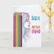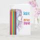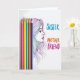 This card features a bright white background with five sharpened colored pencils lined up vertically on the left in fuchsia, yellow, light blue, orange, and deep indigo. Just to the right, a woman’s face appears in side profile with a soft, calm expression, as if she’s looking toward someone she trusts ❤️. Her hair flows outward in many thin, sweeping strands, each strand shifting through rainbow-like colors that echo the pencil shades and suggest a close, affectionate bond in the way they intertwine. To the right of her face, three large words are stacked in uppercase, reading “SISTER,” “MOTHER,” and “FRIEND,” each in a different color that matches the artwork. The lettering sits mid-right on the page, with “SISTER” in blue, “MOTHER” in orange, and “FRIEND” in magenta, balancing the pencils on the opposite side. The spacing leaves plenty of open white area, making the colors and the gentle profile stand out without feeling crowded 🌼. The pencil tips point upward, and the colored strands of hair sweep toward the text on the right.