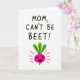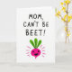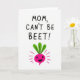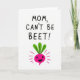 This greeting card features a simple digital illustration on a bright white background, keeping the focus on a sweet, friendly message. At the top, large hand-drawn letters in a strong pink tone read “MOM, CAN’T BE BEET!”, centered and easy to spot. Below the text sits a stylized beet in vivid fuchsia-pink, drawn like a cheerful little character with a wide black smile that feels like a warm grin shared between loved ones ❤️. A leafy crown in rich green sprouts from the top, adding a fresh contrast and a gentle, caring feel. Short pink lines radiate around the beet, like little bursts that suggest excitement and affection without needing extra details. The shapes are flat and graphic, with crisp edges that keep everything clear and modern. The beet’s rounded body, bright color, and friendly face make the pun feel like a lighthearted hug 🌼. Small fuchsia rays surround the beet, evenly spaced against the white background.