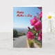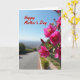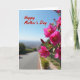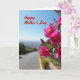 Designed with a sunny landscape scene, this card features a brilliant blue sky stretching across the top and soft, rolling hills fading into the distance. On the right third, a cluster of fuchsia-pink blossoms takes center stage, their petals opening gently as if leaning toward one another in a tender, affectionate pose ❤️. Tiny yellow stamens glow at the flower centers, catching the light and adding a sweet, friendly warmth to the close-up. A shallow-focus look keeps the flowers crisp while the background turns into a smooth blur, like a quiet moment shared just for two. On the left side, a narrow road curves downhill toward a faraway, hazy city tucked among green hills, suggesting a calm journey and togetherness. Near the upper left of the sky, red lettering is placed clearly against the blue, standing out as the main message without crowding the scene 🌼. The final detail is the sunlit texture on the petals, with bright highlights along the edges and softer shadows underneath.