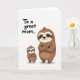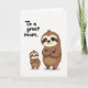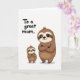 This greeting card features two friendly tree-dwelling animals on a white background, posed close together in a way that suggests a sweet family bond ❤️. The larger, adult-like figure stands on the right with arms crossed, wearing a calm, caring smile that feels steady and reassuring. On the left, a smaller, younger companion mirrors the same crossed-arm pose, looking up with bright eyes as if proudly copying the grown-up. Both characters are shaded in warm earthy browns with lighter face markings, deep dark eyes, and rounded shapes outlined in crisp black. In the upper left, the message “To a great mom.” appears in a casual hand-drawn style in black, leaving plenty of open space around it. The simple setting keeps attention on their shared pose and matching grins, like a quiet moment of togetherness 🌼. Under their feet, faint gray shadows sit lightly on the white ground.