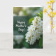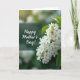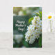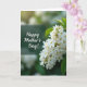 This card features a close-up cluster of small white flowers on the right, each with five soft petals and a golden-yellow center, with a few buds tucked in like a gentle promise of more blooms. Deep green leaves surround the blossoms, and the way they lean toward one another suggests a tender closeness, like family gathered in a quiet moment ❤️. Behind them, the background fades into a softly blurred garden of green tones, as if sunlight is filtering through trees. On the left side, a tall rectangular panel in dark forest green creates a calm space for the message. A thin double border outlines this panel with a faint metallic look, giving it a refined frame without feeling fussy. Centered inside, the text “Happy Mother’s Day!” appears in smooth white lettering that stands out clearly against the dark green. The flowers and foliage stay concentrated on the right edge, with crisp petals in front and a soft green glow fading into the distance 🌼.
