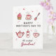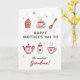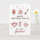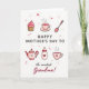 This card features a soft digital illustration that honors a caring mother figure with gentle, cozy details ❤️. In the center, a short Mother’s Day message sits in warm pink lettering, with smaller accent words placed just below in a lighter tone. Around the text, tiny hearts and small starburst shapes float across a white background, like little reminders of affection shared over everyday moments. Near the top, a cupcake with rosy frosting rests beside a steaming teacup decorated with small red hearts, suggesting a quiet chat between loved ones. A slim spoon sprinkled with colorful dots sits nearby, adding a sweet, friendly touch 🌼. Lower down, a round teapot with a pink lid and a simple smiling face feels like it’s welcoming you in for another comforting pour. Beside it, a baby bottle marked with a heart and a striped mug with rising steam hint at nurturing care and close family bonds. The palette stays in tender pinks, creamy ivory, and warm browns, with the cups, teapot, and little floating hearts arranged neatly around the centered text.