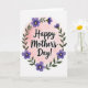 This design shows a celebratory phrase centered on the card, set within a soft blush-pink watercolor circle that feels like a gentle glow behind the words ❤️. The lettering is thick and black with a faint light outline, making it stand out clearly against the rosy wash. Around the message, a leafy wreath curves in a close embrace, like a quiet hug between close friends. The foliage is painted in deep forest greens, with layered leaves that add depth and a calm, natural contrast. Scattered through the wreath are six-petaled flowers in rich violet and deep indigo, each one drawing the eye with a golden-yellow center 🌼. The watercolor texture shows through in the background and the botanical details, giving the edges a soft, brushed look rather than sharp lines. A wide white border frames the central circle and wreath, keeping the composition airy and focused on the florals and text. The wreath forms a near-complete ring, with clustered purple blooms at the sides and small green leaves filling the gaps.