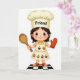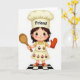 Designed with a cute animated-style little chef at the center, this card features a bright white background that makes the figure stand out. The character wears a puffy cream chef hat with the word “Friend” printed across the front in simple, dark lettering, setting a caring, close-to-you tone ❤️. A sunny yellow shirt peeks out beneath a cream apron covered in tiny frosted cupcakes in soft pastel colors, like small treats meant to be shared with someone special. The chef’s wide eyes and rosy cheeks, along with tidy brown hair, give a gentle, friendly look that feels like a warm hello from a close companion. One hand lifts a wooden spoon as if inviting you into the kitchen for a shared baking moment, while the other wears a bright orange oven mitt for a cozy, homey touch 🌼. Beneath the character, a black-and-white checkerboard floor pattern adds a classic kitchen feel and grounds the scene. The cupcakes on the apron show little swirls of frosting and sprinkles in pink, blue, and yellow against the creamy fabric.
