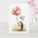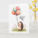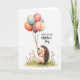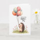 Designed with a soft watercolor look on a white background, the scene centers on a round little woodland creature with hedgehog-like quills in gentle earthy tones. Its rosy cheeks and wide smile pair with bright, sparkling eyes, giving it a sweet, affectionate presence that feels like it’s sharing a quiet “I’m thinking of you” ❤️. It stands on a small patch of green grass sprinkled with tiny pink flowers, as if waiting in a garden corner for someone special. In its paws, it holds seven floating balloons that lift upward in pastel coral, blush pink, pale blue, and muted lavender with light shading for a softly glowing effect. The words “WITH LOVE ON Mother’s Day” sit in the upper right in a flowing, elegant style, set in a dark gray tone that stays gentle against the white space. The open background leaves lots of breathing room, drawing attention to the tender way the creature leans slightly toward the balloon strings, like it’s offering them to a loved one 🌼. The balloons arc above its head in a loose cluster, their thin strings gathered neatly in its small paws.