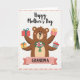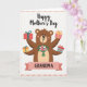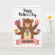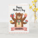 This card features a cute, stylized bear with rosy cheeks and a friendly smile, holding out a bouquet as if offering it to someone special ❤️. The bear’s extra outstretched arms add a sweet, generous feel, with three of them cradling wrapped gift boxes decorated in polka dots and stripes. The flowers mix pink, white, and yellow blooms with green leaves, tied together with a red ribbon, giving the scene a tender, affectionate look. The gift ribbons pop in teal, orange, and red, suggesting a cheerful exchange between close friends or family. A soft pink-and-white diagonal striped border frames the illustration, keeping the focus on the bear in the center. Near the top, a flowing line of text in a dark tone sits above the character, while a wide soft-pink banner with dashed detailing stretches along the bottom with lighter lettering, and a small 🌼 accent nearby. The background stays light and pastel, and the lower banner’s stitched look is clearly visible beneath the bear’s feet.