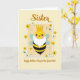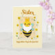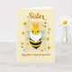 This card features a vertical illustration of a friendly, human-like bee that feels like it’s being lovingly celebrated by family ❤️. The bee has a sunny yellow face with black eyes and a small, sweet smile, topped with a golden crown and paired with a fluffy white beard that adds gentle humor. Its rounded body shows black-and-yellow stripes, and two soft pastel-blue wings sit at its sides, giving it an airy, light look. The character sits inside a light beige rectangle bordered in white, like a framed photo set against a creamy yellow background. Near the top, the word “Sister” appears centered in caramel-colored cursive-style lettering, and the lower text reads “Happy Mother’s Day to the Queen Bee!” in a darker, easy-to-read print. Around the frame, flat flower shapes in warm yellow and white drift in close, with small green leaves that make the scene feel tender and cared for 🌼. Subtle shadowing under the flowers and frame creates a layered, cut-paper effect. The flowers overlap the edges of the beige frame, with yellow blooms clustered near the corners against the buttery yellow backdrop.