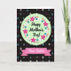 This card features a tall layout with a large pale green oval near the top, lightly textured with diagonal stripes. Inside the oval, a circular wreath of stylized flowers surrounds the message, with fuchsia five-petal blooms with small white centers mixed among white daisies, deep blue flowers, and tiny magenta and orange accents that feel like little gestures of care ❤️. Centered within the oval, the words “Happy Mother’s Day!” appear in black, flowing lettering that stands out clearly against the soft green. Across the lower third, a bright pink ribbon-shaped banner stretches sideways with notched ends, giving the design a friendly, gift-like look. On that banner, “Dear Sister” is written in white, flowing lettering, like a close note passed between family members 👩. The background is a deep near-black field sprinkled with small diamond shapes in muted light blue, violet, and soft gray, adding a gentle sparkle without stealing attention. The wreath’s fuchsia petals and the pink banner pop against the dark backdrop, while the diamonds sit scattered behind them like tiny, softly glowing confetti. The oval, wreath, and banner are centered vertically, with the diamonds spaced around them in the background.