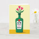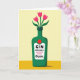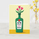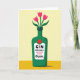 This card features a dark green bottle-shaped vase centered on the front, with rounded shoulders and a short, sturdy neck that feels steady and reassuring. Three fuchsia-pink, tulip-like flowers rise from the opening, their green stems and leaves fanning outward as if leaning in close like old friends ❤️. A white label sits on the bottle’s front with bold black lettering across the middle, and a smaller, looser black word placed just beneath it for a softer, affectionate touch. Just above the label, a small red circle adds a bright accent that echoes the pink petals and draws the eye. The artwork has a fine speckled texture throughout, giving the shapes a gently printed look without heavy detail. Behind the vase, the background is split into two warm tones: a pale buttery yellow on top and a deeper ochre-yellow band along the bottom 🌼. A soft gray shadow falls slightly to one side at the base of the bottle, grounding it against the two-tone yellow backdrop.