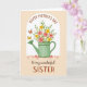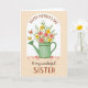 This card features a soft rounded arch framing a slightly weathered mint-green watering can that holds a full bouquet, and the flowers lean toward one another as if sharing a quiet, affectionate moment ❤️. Coral-pink blossoms with darker ruby centers mix with sunny yellow florets and crisp white daisy-like blooms, tucked among fresh green leaves for a garden-fresh look. The can shows gentle texture with small touches of rust and wear, adding a cozy, lived-in feel to the scene. Near the upper left, two small winged creatures in warm tangerine and goldenrod drift upward side by side, like close companions rising on the same breeze 🌼. A warm beige background keeps everything calm and softly lit, like late-morning light in spring. The main message sits above the bouquet in flowing cursive-style lettering, with a second line placed below in thicker, darker letters, both in tones that echo the flowers. At the bottom, a few blush-colored petals are scattered beneath the can, and the arch border stays softly rounded around the illustration.