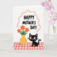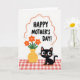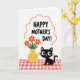 This card features a simple, friendly illustration with the words “HAPPY MOTHER’S DAY!” placed near the top in dark lettering against a white background. The text sits inside a wavy orange outline that curls around it like a soft cloud, adding a cozy, affectionate feel ❤️. Below, on the left, a bright yellow vase with faint horizontal lines holds three small orange flowers with green stems, like a sweet little gift set out on a table. On the right, a black cat lounges calmly, its wide white eyes and gentle smile giving it a tender, companionable look. Pink inner ears and small rosy cheeks make the cat seem extra warm, as if it’s quietly sharing the moment with someone nearby 🌼. Everything rests on a red-and-white checkered surface that suggests a kitchen table or picnic cloth. The orange border loops around the top message, while the yellow vase and black cat sit side by side above the checkered pattern.