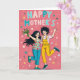On the front of the card two cheerful cartoon-style figures stand close together on a coral-pink background, sharing a moment that feels like a friendly celebration ❤️. On the left, a dark-haired person in a floral top and teal pants leans in with rosy cheeks, offering a full bouquet of mixed flowers with an open, welcoming posture. Beside them, a companion with spiky dark hair wears yellow overalls over a striped shirt, smiling wide with both hands lifted as if cheering them on. Their eye contact and mirrored grins add a gentle, affectionate energy, like friends or partners enjoying a sweet surprise. Across the top, large rounded letters display a short message in a light, high-contrast color that stands out clearly against the warm background. Smaller decorative shapes—tiny flowers, leaves, and dots—are scattered around the pair, adding a soft garden feel 🌼. Pastel blossoms and little leaf sprigs float around the edges, with a few dots sprinkled between them.