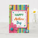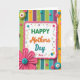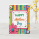 Designed with a cheerful, craft-inspired look, this Mother’s Day card centers on a large white plaque with soft edges, outlined by a wavy pink border. Across the plaque, the text reads “HAPPY Mothers Day Nan,” with “HAPPY Mothers Day” in mixed bright green, warm orange, and teal lettering, and “Nan” in a thinner, more delicate style that feels especially caring ❤️. Behind it, vertical stripes in greens, blues, purples, yellows, and oranges create a lively backdrop that keeps the eye moving. Around the edges, scattered button-like circles, dotted accents, and curling swirls in pink, blue, green, and yellow add a friendly, affectionate energy, like little notes of attention placed all around 🌼. The raised-looking details and layered shapes give the design a tactile, cozy feel, like a keepsake meant to be held close. In the lower left corner, a large fuchsia flower with many petals stands out, finished with a teal button center. The pink border gently ripples around the white plaque while colorful stripes run straight down the background.