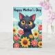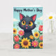 This card features a stylized black cat centered in the lower two-thirds of the design, sitting in a flower-filled meadow under a soft pastel blue sky with small white clouds. The cat’s big golden eyes shine with tiny highlights, and its rosy cheeks and little pink tongue give it a sweet, affectionate look, as if it’s gazing up at someone it adores ❤️. Around it, warm yellow sunflowers with deep brown centers mingle with pink daisy-like blooms and red tulips, creating a cozy, springtime setting that feels like a gentle hug. The flowers crowd the foreground in layers, making the scene feel abundant and close, like you’re kneeling right beside the cat. Across the top, the words “Happy Mother’s Day” appear in dark lettering that stands out clearly against the blue background. The cat’s upward glance and relaxed posture add a quiet sense of closeness, like a friendly companion waiting for attention 🌼. The dark fur contrasts strongly with the bright petals, and each blossom is outlined distinctly with visible stems and clustered leaves.