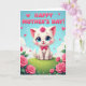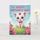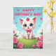 This design shows a sweet, stylized white cat with oversized blue eyes and rosy cheeks, posed in a calm seated position that feels like it’s waiting for a hug ❤️. A soft pink bow sits at its neck, and a single rose blossom rests on its head, adding a gentle, romantic touch. The cat is placed on a rolling green grassy hill, surrounded by clusters of pink roses that curve around it like a garden frame. Above the scene is an aqua sky with pale, fluffy clouds and a scatter of small pink hearts drifting nearby 🌼. Across the top, a celebratory message appears in bright pink lettering, centered and easy to spot against the sky. The lighting is soft and glowy, with tiny highlights in the eyes and a smooth sheen on the petals that makes the scene feel tender and close. Pink roses with layered petals and deep green leaves form a border around the hill beneath the cat.