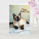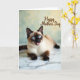 This card shows a vertical scene with a relaxed cat resting on a white surface streaked with faint gray lines like polished stone. The cat has creamy fur with darker brown ears, face, and paws, and its bright blue eyes meet yours with a gentle, affectionate look that feels like a quiet bond ❤️. A tiny pink tongue peeks out, adding a sweet, friendly touch without needing anything else in the scene. Soft, diffused light falls across the fur and the glossy surface, creating mild highlights and a calm, cozy mood. Behind the cat, the background fades into a blurry mix of muted aqua and soft golden tones, like daylight in a peaceful room. In the upper right, the words “Happy Mother’s Day” appear in flowing lettering, colored in warm brown so it complements the darker markings on the cat. The text sits with plenty of open space around it, keeping attention on the cat’s face and those wide blue eyes 🌼. The final detail is the small pink tongue centered just below the dark mask of the cat’s face.