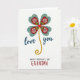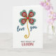 Designed with a bright floral emblem on a white background, the card centers on a clover-like bloom whose leaves are shaped like little hearts ❤️. Deep teal-blue outer petals are sprinkled with small golden dots, and inside them sit crimson heart forms with fine white rays that feel like a gentle hug in flower form. A small red heart anchors the middle, with a touch of green sprouting upward like a caring hand reaching out. From the center, a textured golden stem curls downward in a loose spiral, adding a soft, romantic flow to the layout. To the left and right of the stem, the words “love you” appear in deep indigo, set in flowing lettering that leans slightly like it’s being whispered. Near the bottom, “HAPPY MOTHER’S DAY” is printed in black, while “GRANDMA” stands out in a warm earthy red, and a tiny 🌼 accent sits close to the lower text area. The teal petals, gold dots, crimson hearts, and curling gold stem remain the main visual focus against the open white space.