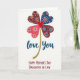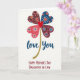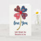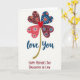 This card features a four-leaf clover shape made from four heart-like petals, each filled with tiny dots and starburst patterns that feel like little affectionate notes shared between loved ones ❤️. The petals mix coral, deep blue, maroon, and reddish-brown tones, arranged so the colors lean toward each other like close friends in a group photo. In the middle sits a solid red heart, acting like the warm focal point everyone’s attention returns to. A gently curving stem drops from the center, shown in a golden, glittery texture that looks like it’s catching light. Beneath the clover, the words “love you” appear in deep blue, placed centrally and written in flowing lettering. Farther down, “HAPPY MOTHER’S DAY DAUGHTER IN LAW” is set in red, all-cap letters that stand out clearly against the background 🌼. The rest of the space stays bright white, giving the patterned hearts room to shine. The golden stem arcs downward from the red center heart toward the blue “love you” line above the red all-caps message.