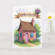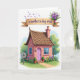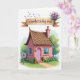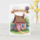 Designed with a cozy, storybook cottage scene, this card shows a pink-brick home glowing with gentle light, inviting you closer like a shared secret between friends ❤️. A scalloped brown tile roof curves over a lavender arched door, while bright blue window frames suggest a warm, welcoming interior. A neat stone path leads to the entrance, bordered by flowerbeds filled with pink, blue, yellow, and white blooms that lean toward each other as if in quiet conversation 🌼. Near the walkway, two cone-shaped potted shrubs stand like friendly greeters on either side. Across the top, an ochre banner carries the main message in dark lettering, with a small cluster of deep purple flowers beneath it tied together with a soft pink ribbon. In the upper left, tiny purple petal shapes scatter like little sparks against a softened blend of green foliage and pale blue sky. On the left foreground, an octagonal birdhouse-style structure sits on a wooden post, adding a rustic detail beside the garden.