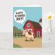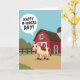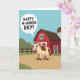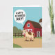 This Mother's Day card shows a friendly cartoon cow in warm cream with chocolate-brown patches, standing front and center with wide eyes, a soft pink snout, and a rosy udder that adds a sweet, affectionate touch ❤️. The cow stands on a dusty tan path that leads into a cozy farm scene, as if it’s waiting to share a fond greeting with someone special. Behind it sits a bright red barn with white trim and a tall gray silo, creating a calm countryside backdrop. Rolling green hills and a simple wooden fence stretch across the middle of the scene under a clear sky-blue background. A large white speech bubble floats near the cow’s head, angled outward like it’s speaking directly to the viewer. Inside the bubble, the phrase “Happy M-udders Day!” appears in dark lettering that’s easy to read and centered within the shape 🌼. The colors stay sunny and flat with no shading, keeping the farm details crisp and cheerful, with the barn’s roofline and fence rails clearly outlined. The white speech bubble has a rounded shape with a small tail pointing toward the cow’s mouth area.