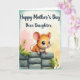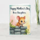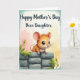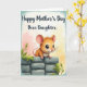 Designed with a soft, storybook-style digital illustration, this card centers on a small rodent-like creature with golden-orange fur and oversized ears peeking over a grey stone wall, its tiny paws curled over the cool, textured surface. Its deep blue eyes and gentle lashes give it a tender, affectionate look, as if it’s shyly reaching out to someone it cares about ❤️. A dainty pink nose and fine whiskers add to the sweet expression, while bits of green moss and leafy plants spill over the wall like a quiet garden hug. Behind the scene, the background fades in a watercolor-like gradient from blush pink on the left to warm yellow on the right, creating a calm, sunlit glow. Near the top, the message “Happy Mother’s Day Dear Daughter...” is placed prominently in a dark, elegant cursive-style lettering that stands out against the pale wash. The overall layout feels balanced and gentle, with the character centered low and the text floating above for easy reading 🌼. Small clusters of greenery frame the stone barrier, with soft shadows and speckled texture visible across the grey stones.