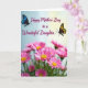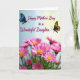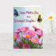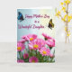 This greeting card features a loving message paired with a garden-like scene that feels close and affectionate ❤️. Near the top, the text reads “Happy Mother’s Day to a Wonderful Daughter” in flowing fuchsia lettering, centered and easy to spot against a soft gradient sky. The background shifts from pale blue on the left to gentle, sunlit yellow on the right, like morning light spreading across the page. On either side of the message, two delicate winged insects hover as if drawn together, one with dark wings patterned in sapphire-blue tones and the other glowing in golden-yellow and deep amber. Below, a thick cluster of pink, daisy-like flowers fills the foreground, their many petals circling bright yellow centers that feel like little suns 🌼. More blossoms fade into a soft blur behind them, adding depth and a quiet, tender atmosphere. The bottom half is packed with pink petals and golden centers, while the upper half stays airy with the blue-to-yellow gradient and the two insects flanking the fuchsia text.