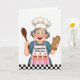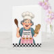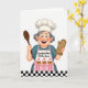 Designed with a cheerful kitchen scene on a bright white background, this card features an expressive older woman smiling wide with rosy cheeks, as if sharing a friendly laugh ❤️. Her short, curly gray hair peeks out from under a tall white chef hat, and her relaxed posture gives her an easy, welcoming presence. She wears a teal outfit topped with a soft pink apron that feels cozy and affectionate, like a warm hug offered through baking. On the apron, three frosted cupcakes are illustrated with white swirls and small red cherries, adding a sweet, shareable touch 🌼. Across the apron, the phrase “Kitchen Queen” appears in dark lettering, centered and easy to read against the pink fabric. In her right hand she holds a long wooden spoon angled upward, while her left hand wears a brown oven mitt held close as if ready to pull a treat from the oven. Along the bottom edge, a black-and-white checkerboard strip runs horizontally like a kitchen floor tile border.