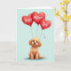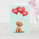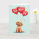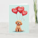 This card shows a golden-coated puppy sitting in the lower half of the design, looking up with big dark eyes that feel like a gentle, affectionate gaze ❤️. Its small pink tongue peeks out, adding a friendly, cozy touch as if it’s waiting beside someone it loves. Above the pup, three red heart-shaped balloons float upward on thin strings, creating a sweet scene that suggests closeness and care. The words “Happy Mother’s Day” appear in white letters across the balloons, easy to read against the red shapes. A soft sky-blue background keeps everything calm and light, while the warm amber fur stands out with subtle texture. Light shading beneath the puppy grounds it on the page, and the overall layout leaves open space around the balloons so the message feels airy. Near the upper right, a few tiny floating hearts add an extra hint of tenderness 🌼.