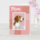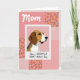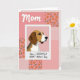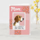 This greeting card features a stylized portrait of a friendly tri‑color dog in warm brown, white, and soft dark tones, set inside a bright white frame like a small photo. The dog’s gentle eyes and slightly off‑center gaze feel like a quiet moment of companionship, as if it’s looking toward someone it trusts ❤️. Behind the frame, the background is a patchwork of pink sections that resemble a cozy quilt, mixing orange flower shapes with green leaves, small checks, scattered dots, and tiny heart patterns. Near the top, the word “Mom” sits centered in a flowing cursive style, colored in a deep pink that stands out against the lighter backdrop. Along the bottom, a shorter greeting line runs horizontally in a casual handwritten look, also in pink, balancing the design without crowding the main image. The overall layout keeps the dog as the focal point while the patchwork patterns add a soft, affectionate setting 🌼. In the corners and side panels, you can spot alternating squares of gingham, polka dots, and mini hearts in varying pink shades.