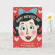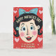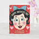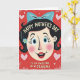 This card shows a retro-style illustration of a smiling woman’s face centered on a deep ruby-red background, with wide blue eyes, rosy cheeks, and a friendly grin that feels like it’s meant for someone close ❤️. Her dark hair is neatly arranged and topped with a large pastel-blue bow, with a small sky-blue flower tucked near one ear for a soft, romantic touch. Above her head, a short greeting curves in an arch, set in light-colored lettering that stands out clearly against the red. Below her chin, a second line of text sits straight across in a matching light tone, like a note meant for a cherished friend or partner. The background has a subtle textured look that gives it a slightly vintage feel without being busy. Scattered around the portrait are small pink hearts and a few tiny white decorative marks, adding a gentle, affectionate mood 🌼. The outlines are thick and simple, and the palette mixes primary shades with pale blues and pinks for a cozy, cartoon-like look. The pastel-blue bow sits at the crown of her head, with the blue flower placed just to the side near her ear.