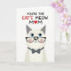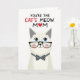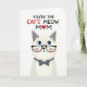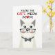 This card features a stylized, human-like cat centered on a bright white background, giving the scene lots of open space while keeping the focus on a sweet, affectionate mood ❤️. The cat has creamy white fur with very light shading, and its wide sky-blue eyes feel soft and attentive, like it’s looking at someone it adores. Thick black glasses frame its face, adding a gentle, bookish charm, while faint pink blush on the cheeks suggests a shy, friendly warmth. Just below the face sits a neat dark gray bow tie dotted with small white polka dots, adding a dressed-up touch without crowding the design. Above the cat, a short message appears near the top in a loose, hand-drawn style, colored mainly in red with a small heart detail 🌼. The lettering stands out clearly against the white space, with the heart acting like a tiny accent that pulls your eye back toward the character. The final visual is the cat’s centered pose beneath the red text, with black glasses, blue eyes, rosy cheeks, and a polka-dot bow tie on the white field.