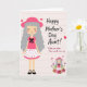 This greeting card features a stylized animated woman on the left with soft gray wavy hair under a wide fuchsia hat, her eyes closed and cheeks lightly blushed as if savoring a loving thought ❤️. She wears a bright pink top with a small black bow, a white skirt sprinkled with fuchsia polka dots, and simple black shoes, giving her a sweet, friendly presence. On the right side, a flowing cursive-style message in dark lettering reads, “Happy Mother’s Day Aunt! I love you more than words can say,” with the lines stacked neatly to fill the open space. Small crimson hearts float around the words, adding a gentle romantic warmth without crowding the layout 🌼. In the lower right corner, a tiny version of the same character peeks out from a cluster of pink, purple, and deep red flowers, as if sharing a quiet inside joke with the viewer. The background looks like pale, horizontal wooden planks, keeping the scene soft and cozy while letting the pinks and reds stand out. Little sparkly dots are scattered among the blossoms near the bottom right, catching the eye like tiny glints of light.