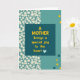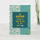 Designed with a calm, romantic touch, this card features a dark teal rectangle set slightly off-center as the main focal area. Inside the rectangle, the message “A MOTHER brings a special joy to the heart” appears in bright yellow, with the words arranged in neat lines and a small light blue heart icon tucked beneath the text ❤️. The background is divided into sections, with the upper left and a vertical strip along the left edge filled with tiny ivory daisy-like flowers on a pale teal field, like a gentle bouquet leaning in close. To the right, a wide open space of light teal creates breathing room, giving the layout a quiet, affectionate balance. Across that open area, a few round dots in warm yellow and deeper teal drift like soft confetti, adding a friendly, companionable energy 🌼. The contrast between the floral pattern and the smooth solid panel makes the design feel like a tender note placed on a table beside fresh blooms. Small circular accents in yellow and teal are scattered mostly over the right-side light teal area.