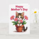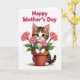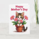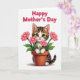 This card shows a cute, stylized cat-like creature peeking up from an earthy terracotta pot, setting a gentle, affectionate tone ❤️. Its tabby fur mixes warm browns and creams with darker stripes, and its large emerald-green eyes look forward with a tender, trusting gaze. Small white paws rest on the rim as if it’s proudly presenting the flowers, adding a friendly, caring feel to the scene. A bunch of bright pink, daisy-like blooms rises from the pot, each with a sunny yellow center and surrounded by leafy greens 🌼. The background stays plain white, making the soft textures and warm colors stand out without distraction. Near the top, the words “Happy Mother’s Day” appear in rosy pink lettering, centered above the illustration. Gentle, diffused lighting highlights the fluffy fur and the curved petals, keeping everything soft and cozy. The terracotta pot sits below the text with pink flowers and green foliage filling the space above its rim.