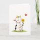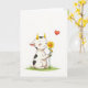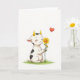 This card shows a sweet digital illustration of a small calf-like creature with a soft white body, irregular black spots, and shiny golden horns, resting near the lower center on a narrow strip of bright green grass. Its eyes are closed and its cheeks are rosy, with a gentle smile that suggests it’s quietly savoring a caring moment ❤️. In its little hooves, it holds a sunflower-like bloom with yellow petals and a warm orange center, as if offering it with tender affection. A tiny bird perches on the flower’s stem, leaning in like a friendly companion sharing the scene. Above and slightly to the right floats a glossy red heart, adding a clear romantic note without crowding the open space. The background remains wide and white, letting the greens, yellows, and red stand out while keeping the focus on the soft connection between the characters 🌼. The text sits near the top in a simple dark tone, leaving the heart and flower unobstructed against the white backdrop.