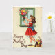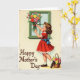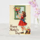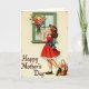This card shows a retro-style illustration of a young girl with curly brown hair and rosy cheeks, looking upward with a tender, focused expression as if she’s preparing a sweet surprise. She wears a bright red dress with a ruffled edge, and a big blue bow tied at the back adds a romantic, gift-like touch. With her arms lifted, she carefully arranges a full bouquet of flowers in pinks, yellows, oranges, and reds, creating the feeling of a loving offering ❤️. The scene sits beside a window outlined in rich green, with soft light giving everything a gentle, nostalgic glow. A pale cream background is dotted with tiny floral sprigs, adding a springtime mood 🌼. Near the lower-left, the words “Happy Mother’s Day” appear in flowing, dark lettering that stands out clearly against the light background. At her feet, a woven basket spills over with extra blossoms, suggesting she gathered more than enough for someone special. The window frame is a deep green rectangle, and the clustered flowers press close to it in a colorful, layered arrangement.
