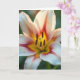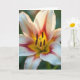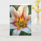 This card features a close-up view of a blooming flower, inviting you right into its softly glowing center ❤️. Five wide petals open outward like a gentle embrace, shaded from creamy white into blush pink with deeper red streaks and a warm yellow glow near the throat. In the middle, rich brown pollen-tipped tips stand around a slender pale green center, creating a tender, almost companionable contrast as the shapes lean toward one another. The lighting feels golden and calm, making the petal edges look slightly see-through and smooth. A few tiny dark specks dot the lighter petal areas, adding a natural, lived-in touch. Any message text would sit best along the lower edge in a muted gray or soft rose color so it doesn’t compete with the bloom 🌼. The background fades into a gentle blur of leafy greens, keeping the flower sharply in focus. Thin crimson lines radiate from the inner yellow area toward the petal tips.