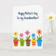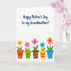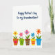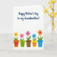 Designed with a bright white background, the card features a dark blue, handwritten-style message placed across the roomy upper half. The lettering sits centered and airy, leaving lots of open space around it so the words feel light and easy to read. Along the lower third, five potted flowers line up side by side like a small row of gifts, each one decorated with little details that feel like quiet notes of affection ❤️. One pot is earthy orange with a single pink heart, another is lime with two small green hearts, and a brown pot carries a simple chevron pattern. A sunny yellow pot is wrapped with red stripes, while a deep blue pot is dotted with white spots, adding a friendly, cozy variety 🌼. Above them, stylized daisy-like blooms open in yellow, fuchsia, turquoise, and orange, each with a contrasting center that makes the petals stand out. The flowers rise on simple stems, evenly spaced, with the colorful pots forming a neat band across the bottom edge.