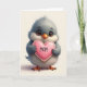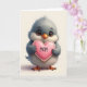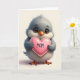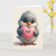 This card shows a small fluffy bird-like creature centered on a soft off-white background, drawn with rounded shapes that feel gentle and cozy ❤️. Its downy body blends pale blue-gray into creamy white, and it faces forward with wide dark-brown eyes that catch bright highlights, like it’s looking at someone it trusts. A tiny curved orange beak adds a warm accent, while faint shadows under the fluff give the figure a cuddly, three-dimensional look. Tucked carefully in its little wings is a plump pink heart, held close the way a close friend might cradle a keepsake. The heart has a scalloped white trim with tiny raised white dots, like sugary decorations, adding a sweet, affectionate touch 🌼. Across the center of the heart, the word “MOM” appears in simple black letters that stand out clearly against the pink. The creature’s bright orange feet with small dark claws rest near the bottom of the design, grounded by a soft gray shadow beneath them.