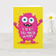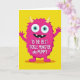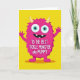 This greeting card features a stylized fuchsia creature centered on a flat lemon-yellow background, giving the scene a sunny, upbeat look 🌼. Its outline is jagged in a way that suggests fluffy fur, and two small creamy horns sit at the top of its head. The creature’s wide-set eyes have turquoise irises and deep black pupils, creating a friendly, attentive gaze that feels like it’s looking right at someone it adores ❤️. A big grin stretches across its face, showing two simple white teeth, while its slightly raised five-fingered hands read like an eager, welcoming wave. A soft ochre shadow under its feet adds a touch of depth without breaking the graphic, two-dimensional style. Across the middle of its chest, bold white lettering is placed in a straight line, standing out strongly against the pink body. The background remains a solid field of bright yellow, with the fuchsia figure and its turquoise eyes sharply contrasted in the center.