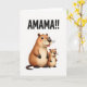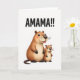 This card shows two round, furry animal-like characters centered on a plain white background, leaning close in a way that feels like a sweet bond between close family or friends ❤️. The larger figure stands slightly behind and above the smaller one, colored in warm chestnut brown with creamy beige patches that soften its look. Its face has rosy cheeks, a tiny pink tongue peeking out, and wide dark eyes that seem to glance down with gentle fondness. The smaller companion mirrors the grin with the same big eyes and fine black whiskers, giving the scene a cozy, together-forever feel. Above their heads, the text “AMAMA!!” sits near the top center in thick, simple uppercase letters, printed in solid black for strong contrast. The fur is shaded with soft, brushy texture while the open white space keeps everything calm and focused 🌼. Thin whisker lines and subtle blush marks add extra detail without crowding the layout. The two characters’ rounded bodies overlap slightly, with the smaller one tucked in front and both sets of whiskers clearly visible against the white.