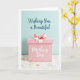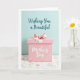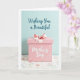 This card shows a pastel pink gift box centered in the lower half of the design, sitting like a sweet little offering between close friends ❤️. A rosy ribbon wraps around it and forms a neat bow on top, catching the light in a soft, satin-like sheen. The background above is a light aqua field with a deep teal line of text placed near the top, written in flowing lettering. On the front face of the box, a short message appears in bright white lettering, surrounded by tiny star-like sparkles and dotted accents that feel like a quiet celebration. The box rests on a white surface with a light texture, where small, simple flowers in gentle pinks and pale blues drift across the bottom area like a spring tablecloth 🌼. Thin green stems and scattered little dots weave through the floral pattern, adding a tender, affectionate touch to the scene. The overall lighting is diffused and even, keeping the pastel palette calm and soothing, with the bow’s loops and tails clearly defined against the pink lid.
