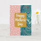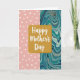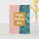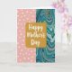 This card centers on a rounded gold panel with a fine glittery texture, giving the design a festive glow ❤️. Inside that panel, the words “Happy Mother’s Day” sit prominently in smooth white lettering, arranged neatly to fill the middle. The background is split vertically, creating a sweet contrast that feels like two sides of a close bond. On the left, a soft pastel pink field is sprinkled with small white polka dots, slightly worn in texture like a gentle, familiar hug. On the right, an abstract marbled section swirls with deep teal, aquamarine, slate blue, and touches of warm gray and muted brown, like calm sea currents drifting together 🌼. The meeting of crisp dots and flowing marbling adds a tender, welcoming energy, as if different personalities are leaning in side by side. The gold panel sits centered over the split background, with the white message clearly readable against the shimmering gold. The marbled side shows layered streaks and curls in teal and blue tones blending into soft gray and brown accents.