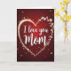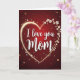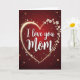 This greeting card centers on the message “I love you Mom” in white lettering placed prominently in the middle, setting a tender, close-to-the-heart tone ❤️. A glowing heart outline made of tiny golden sparkles frames the words, like a gentle hug around the message. The background is a deep red that shifts from darker around the edges to brighter near the center, creating a warm, romantic glow. Soft, scattered light specks float across the scene like distant stars, adding a dreamy touch without distracting from the main text. Small white floral details and delicate snowflake-like shapes are sprinkled around the card, giving it a sweet, caring feel 🌼. Faint heart shapes sit quietly in the background, as if they’re drifting behind the main design. A cluster of small white flowers appears near the golden heart, with a few blooms seeming to rise from its lower curve.