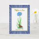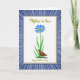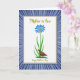 Designed with a framed look, this greeting card centers on a bright white panel that feels calm and inviting, like a quiet moment shared with someone you care about ❤️. Near the top middle, a large blue flower opens wide around a warm orange center, standing tall on a slim green stem. Curved green leaves lift upward beneath it, and at the base a small brown bird with patterned feathers pauses among short greenery, as if keeping gentle company. The bird’s tiny blue eye and still posture add a soft, affectionate mood to the scene. The wording “Mother-in-law” sits along the upper portion of the white panel in golden lettering, while “Happy Mother’s Day” appears near the bottom in the same gold tone. A thin gray border outlines the central panel, separating it from the surrounding background. Around that border, blue-and-white rays spread outward like sunbeams, with a few crisp stripe edges that make the center feel even more special 🌼.