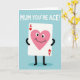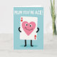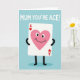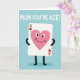This card features a white playing-card character standing upright like a friendly companion, with red hearts in opposite corners and the letter “A” to suggest a top-ranked favorite. At the center, a large pink heart forms the character’s face, with wide eyes and a big smile that feels like a warm, affectionate grin ❤️. Thin dark curved arms stretch out from the sides as if ready for a hug, and short dark legs give it a steady stance that reads like a cheerful wave hello. The message “MUM YOU’RE ACE!” sits above the character in rounded white lettering, centered near the top for easy reading. The simple shapes and gentle expressions create a sweet, close bond, like a tender little thank-you between family or friends 🌼. A soft shadow beneath the feet adds a touch of depth, grounding the character on the page. Everything sits on a pale blue background that makes the white card, pink heart, red symbols, and dark limbs stand out clearly.